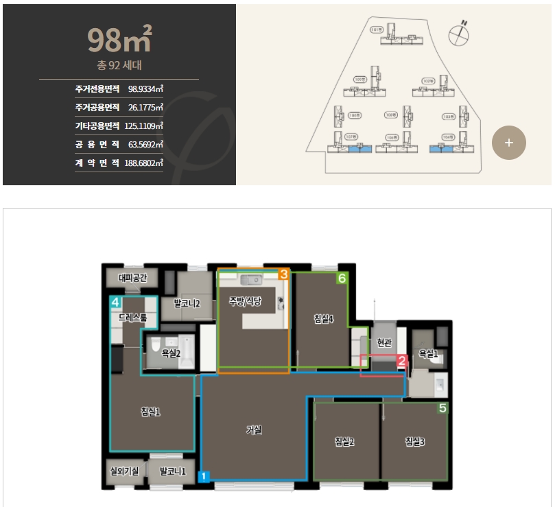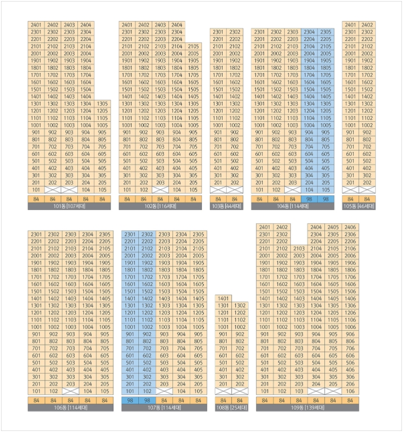 84㎡ 타입이 분양의 가장 많은 수를 차지하고 있기 때문에 가장 많이 분포된 모습을 볼수 있구요 98㎡ 청약을 준비하시는 분들이라면 104동과 107동의 위치를 잘 확인 하시기 바랍니다.