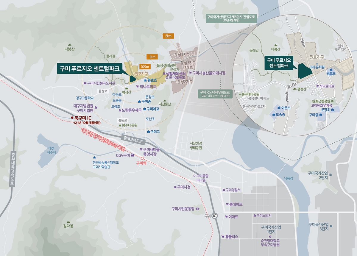 구미 푸르지오 센트럴바파크는 구미 산업단지와 인접하여 직주인접 실현 하여 많은 수요가 예상되고 북구미 IC와 가까워 교통도 편리한 곳에 위치했습니다. 단지 주변 초, 중, 고등학교 위치해서 자녀 안심 학군 형성되었으며 롯데마트 이마트 구미 농산물 도매시장, 하나로마트 등으로 생활 인프라 잘 형성된 모습 볼수 있습니다.