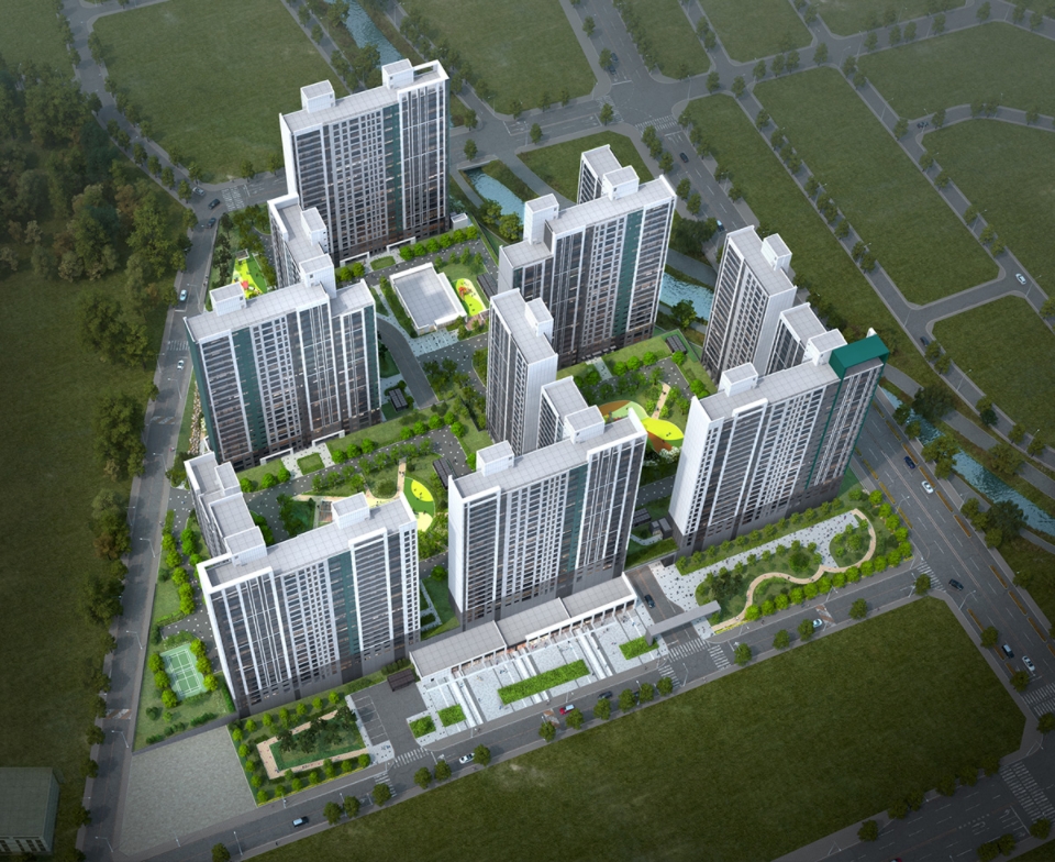 9개 동은 니은자 모양으로 배치되어 있는것으로 보이나 남서향과 남동향을을 바라보게 배치하여 채광을 충분히 확보 한것으로 보이고 단지 가운데 어린이 놀이터를 크게 2개 배치해서 공간감을 확보한것이 좋아 보이는 단지 배치 입니다. 출입구는 2개를 배치하여 교통을 분산하여 혼잡하지 않도록 관리한 모습 볼수가 있습니다.