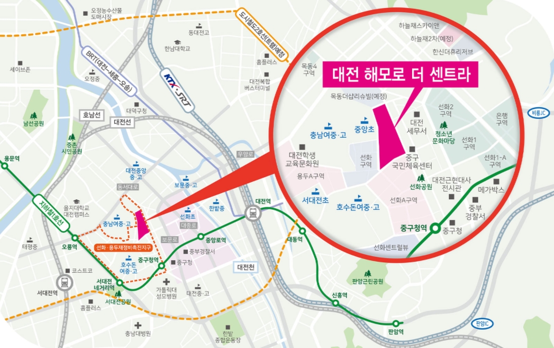 대전 지하철 1호선 중구청역 인접으로 대중교통 이용 편리하고 대전도시철도 2호선 트램이 2027년 예정 및 대전BRT 반석역 ~ 유성복합터미널 2022년 예정되어 있어서 앞으로의 전망 역시 좋습니다. 단지 주변 초, 중, 고등학교 인접되어 있고 코스트코, 홈플러스, 충남대병원, 중구청, 중부경찰서 등 다양한 생활 인프라 형성되어 있는 곳으로 다양한 수요가 있을것으로 예측되는 지역입니다.
