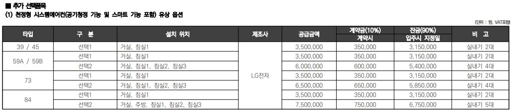 분양가 및 발코니 확장 비용, 시스템 에어컨 설치비용