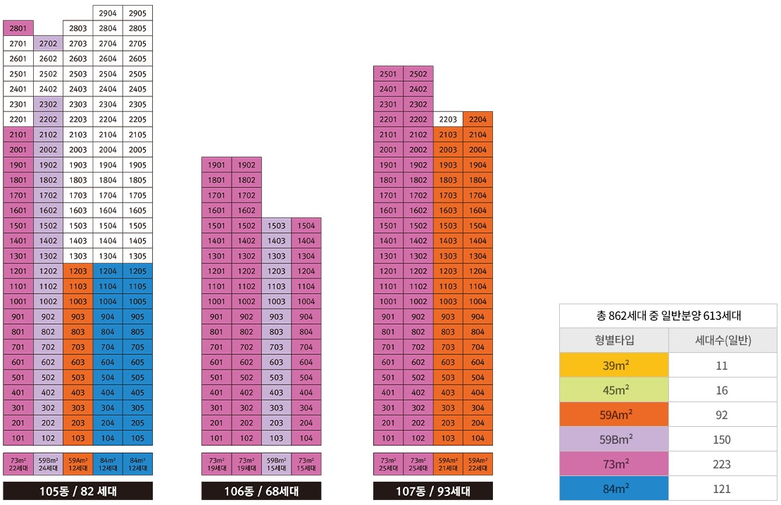동호수 배치중 613세대 일반 분양 세대 배치 확인 하셔서 청약 준비 하시는 분들은 원하시는 타입에 대한 위치 미리 확인해놓으시기 바랍니다.