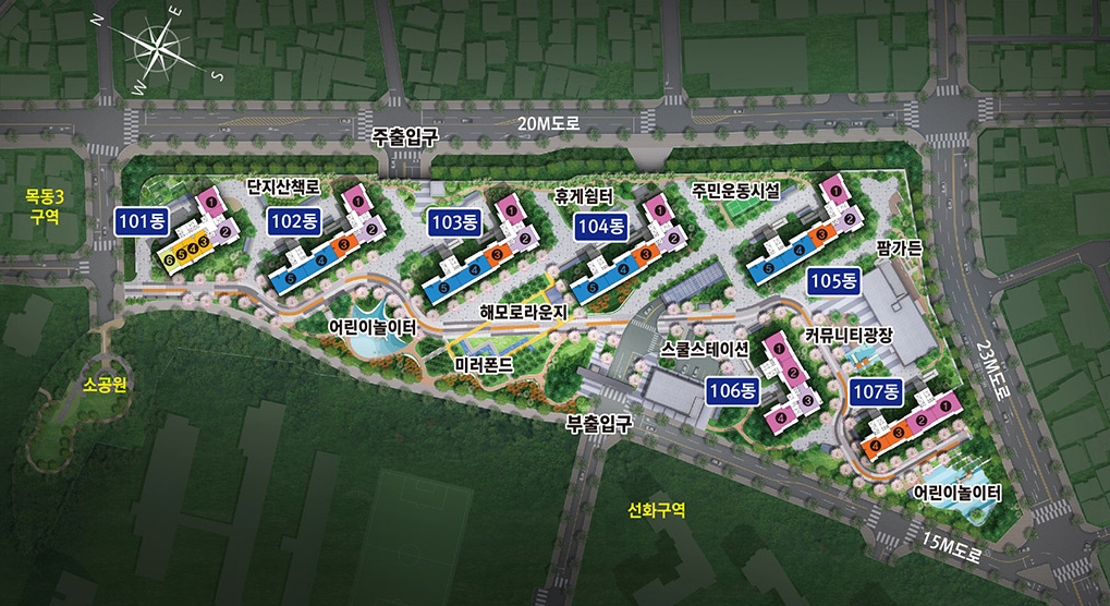 채광과 조망권 확보를 위하여 남동향과 남서향으로 배치한 댄지 배치 설계 볼수있고 어린이놀이터, 커뮤니티 광장, 휴게쉽터, 주민운동시설 까지 잘 갖춘 모습 볼수가 있습니다. 근토로 쪽에 주 출입구와 부출입구 까지 설계하여 혼잡함을 최소화 할것으로 보입니다.