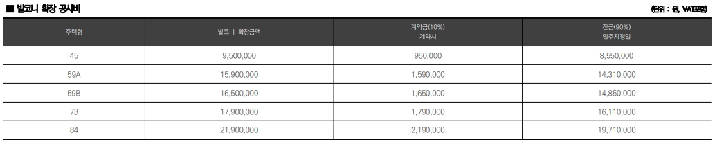 발코니 확장 비용은 950만원에서 2190만원 까지 크기별로 차이가 있고 확장형 선택하실 분들은 분양가에 합해서 계산하시기 바랍니다.