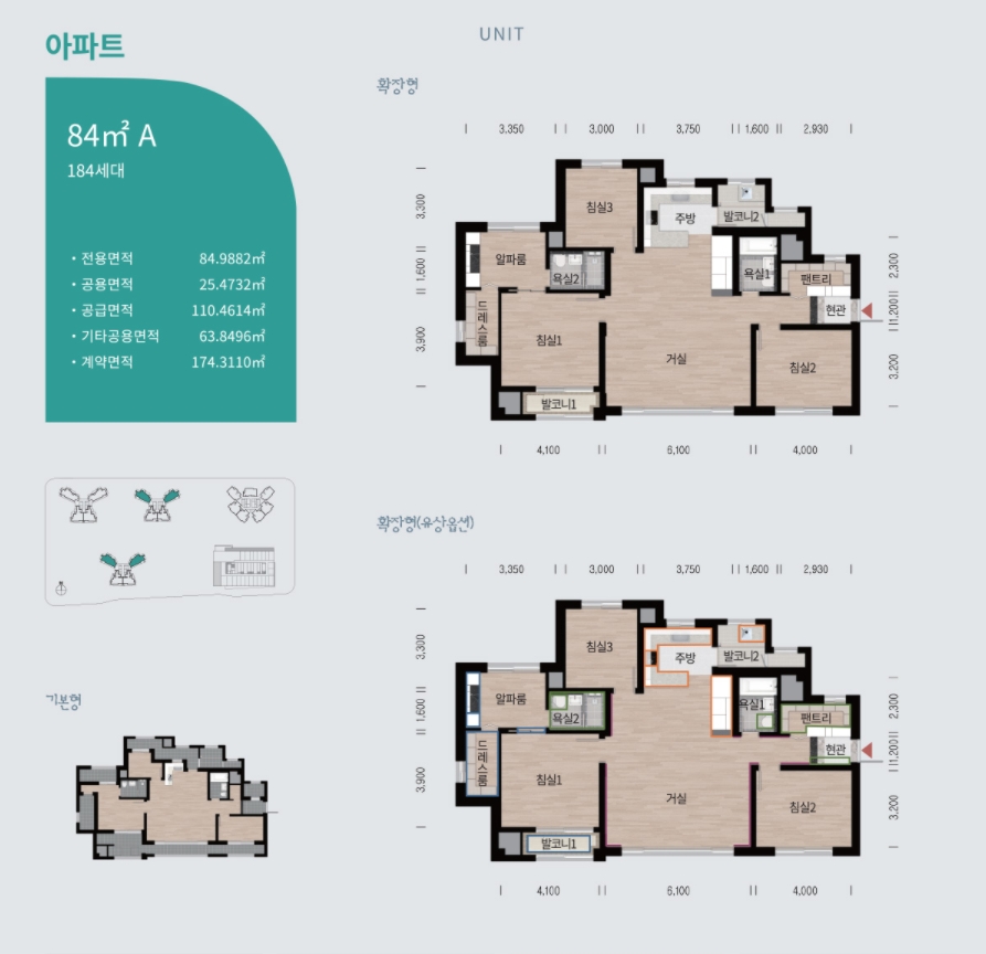 84㎡A, B 타입은 3Bay 구조로 방3, 화장실2개 구성으로 되어 있습니다. 안방에 드레스룸과 파우더룸 까지 완벽하게 배치되어 있고 특히 알파룸 공간이 있어서 공간 활용하기 좋은 구조로 되어 있습니다. 주방에는 밴트리 공간까지 확보한것을 볼수가 있습니다. 주방은 디귿자 아일랜드 식탁으로 구성되어 있고 주부님들이 많이 선호하는 주방 옆 발코니 확보로 다양한 공간 활용을 할수 있다는 장점이 있겠습니다.
