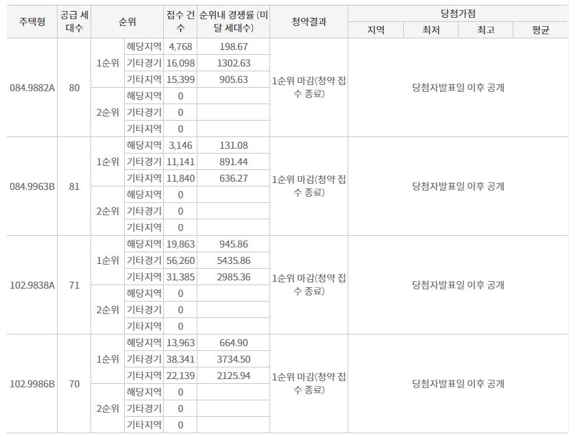 일반분양에서 눈에 띄는 부분은 102A타입 기타경기 부분에서는 무려 5435.86 : 1 이라는 경이로운 경쟁률을 보여줬는데요 이는 나와 경쟁하는 사람이 무려 5434명 이라는 이야기로 당첨이 된다면 정말 로또라고 할수 있을 만큼의 확률이라고 보여집니다.