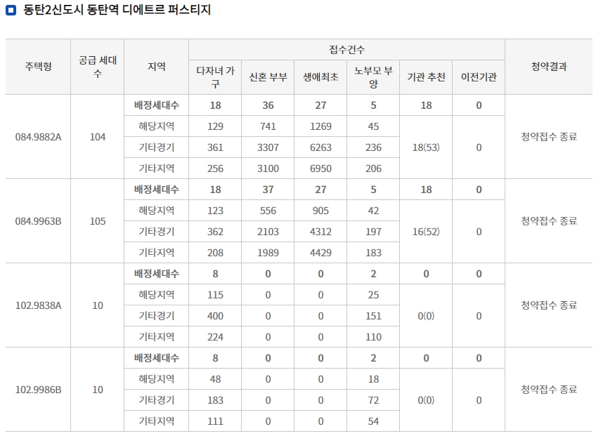 동탄 디에트르 특별공급 경쟁률 부터 살펴보겠습니다. 특별공급에는 무려 3만여명이 청약을 신청하였는데요 가장 눈에 띄는 것은 바로 84 타입의 생애최초 접수건수 인데요 54가구 모집에 2만4128명이 접수신청하여 최종 경쟁률은 446.81 : 1로 집계 되었습니다.
