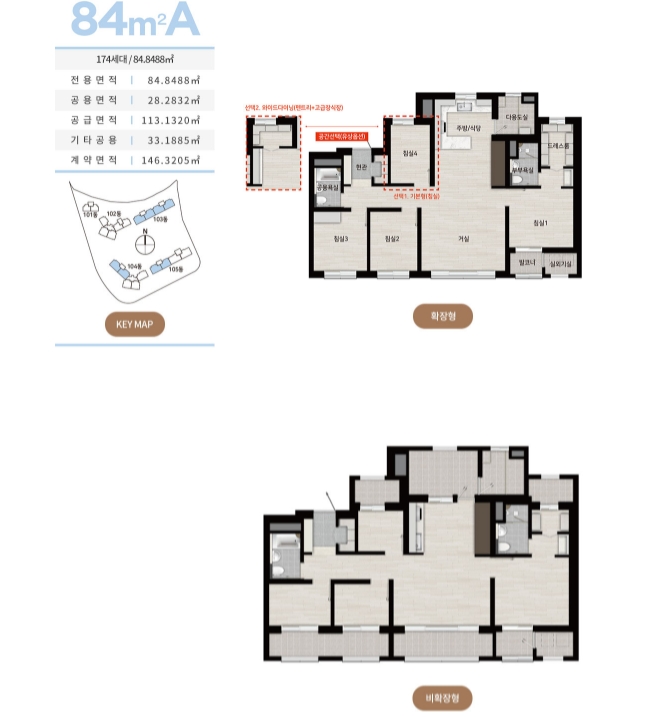 가장 많은 세대가 배정되어 있는 84㎡는 A, B, C 타입으로 나눠서 볼 수 있는데요 C타입을 제외하고는 모두 4 Bay 구조로 개방감 뛰어나고 모든 방에 채광을 어느 정도 확보할 수가 있는 모습을 볼 수가 있습니다. 방 4개 화장실 2개 구조이지만 일부 타입에서는 방 한 개를 다이닝룸 크기로 줄이고 주방을 넓게 사용할 수 있는 옵션도 있으니 잘 확인하셔서 청약에 임하시기 바랍니다.