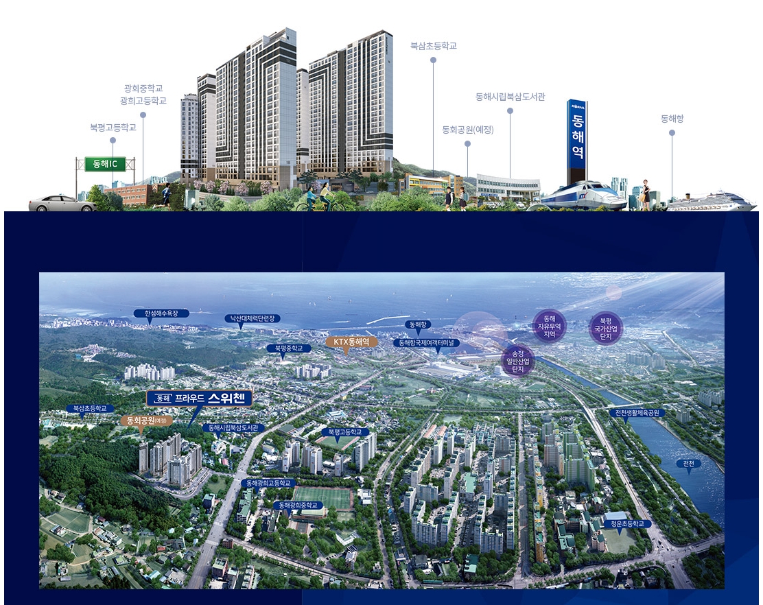 KTX 동해역과 가깝게 있는 단지여서 서울로의 접근성이 좋아서 많은 분들에게 인기 있을 것이라 생각이 되는데요 동해고속도로와 연결되는 동해 IC 역시 가까워 교통의 요지라고 할 수가 있겠습니다.