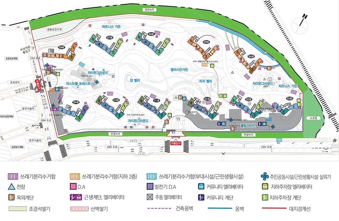 남동향과 남서향의 적절한 배치로 조망권 및 일조권 확보에 가장 효율적은 동 배치 설계 살펴 볼수 있고 다양한 생활 인프라 배치 역시 한쪽으로 쏠림없이 골고루 분포되어 있는 모습 볼수가 있었습니다.