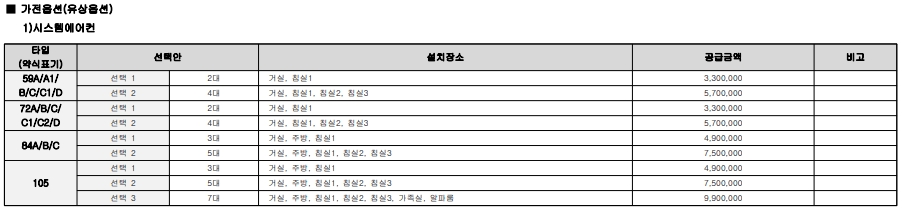 요즘 입주시 많이 선택하는 시스템 에어컨 옵션 가격입니다. 각 방에 시스템 에어컨 설치 예정이신 분들은 확인하셔서 좀더 쾌적한 환경에서 거주하시기 바랍니다.