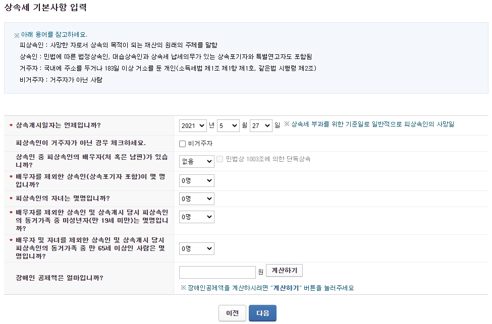 상속세에 대한 기본사항을 입력후 다음 으로 이동하신뒤에 부동산에 관한 정보를 입력하시면 손쉽게 부동산 상속세 계산하실수가 있습니다. 부동산의 경우는 금액을 정확하게 산정하기 어렵기 때문에 참고용으로만 이용하시고 꼭 전문 세무상담사에게 문의하셔서 정확한 상속세를 산출해 보시기 바랍니다.