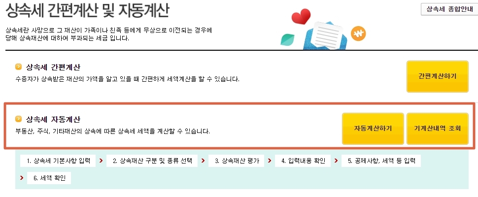 홈택스 홈페이지에서 세금모의계산 으로 이동하시면 다양한 세금을 미리 계산해볼수가 있습니다. 이중 저희는 여기서 상속세 자동계산을 클릭하여 다음으로 넘어가시면 됩니다.