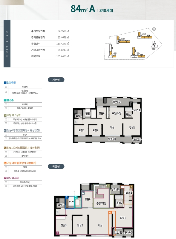 가장 많은 세대가 분양예정인 84 A, B 타입은 타입별로 방의 갯수는 차이가 있지만 각각 방의 넓이가 다르기 때문에 약간은 호불호가 갈라질수 있을꺼라 예상합니다. 방갯수가 중요하신 분들은 A타입을, 넓은 방을 선호하시는 분들은 B타입을 좋아하실꺼라 예상되고 두 타입 모두 4Bay 구성으로 개방감 및 공간 효율 좋을것으로 예상됩니다.