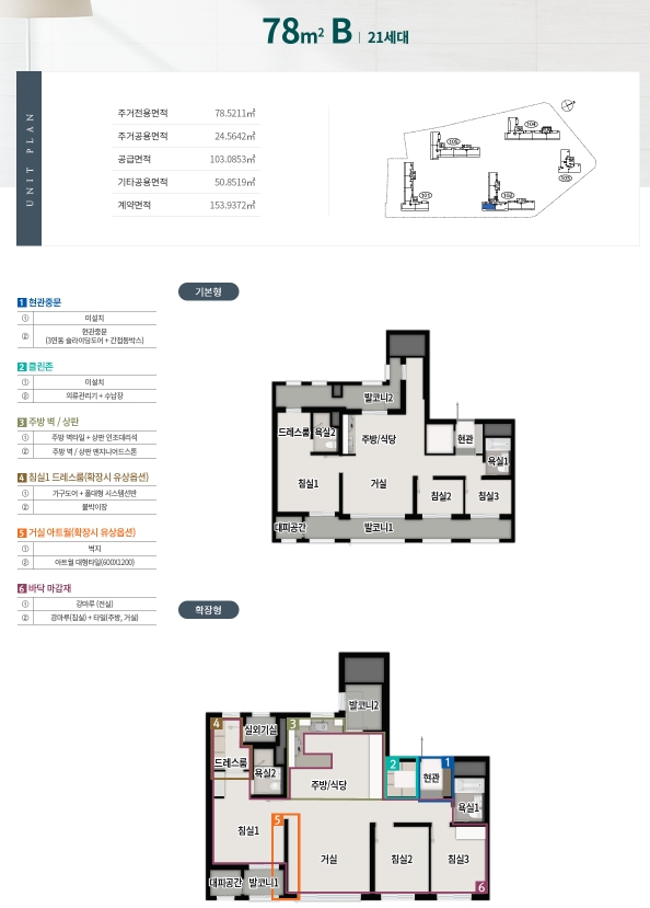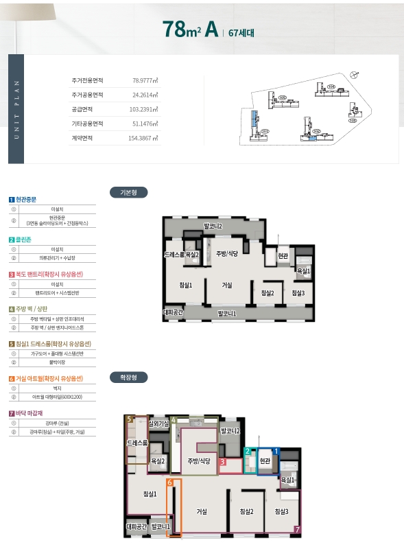 78 A, B 타입은 4Bay 구조의 방 3개 화장실 2개 구조로 안방에 드레스룸 까지 완벽하게 구성되어 있고 확장형 선택시 드레스룸과 주방이 상당히 넓어지는 효과를 볼수가 있습니다.