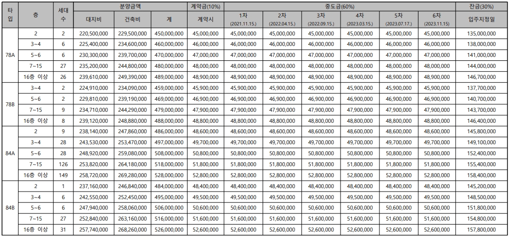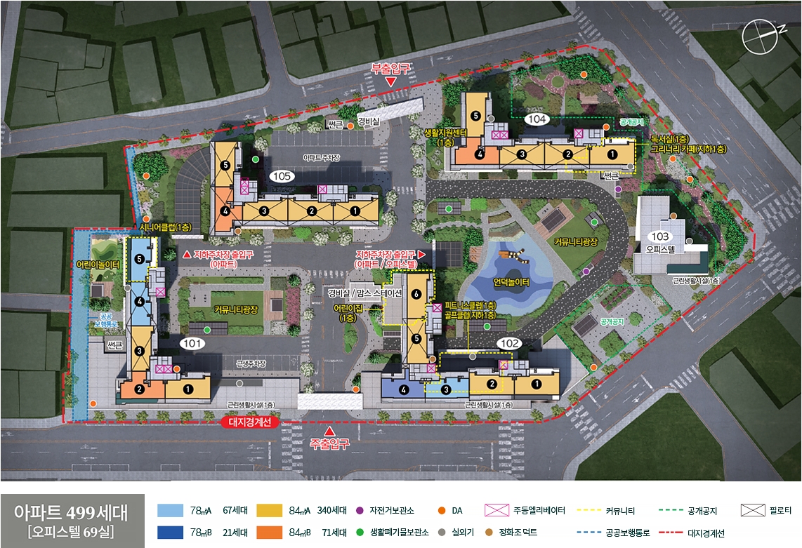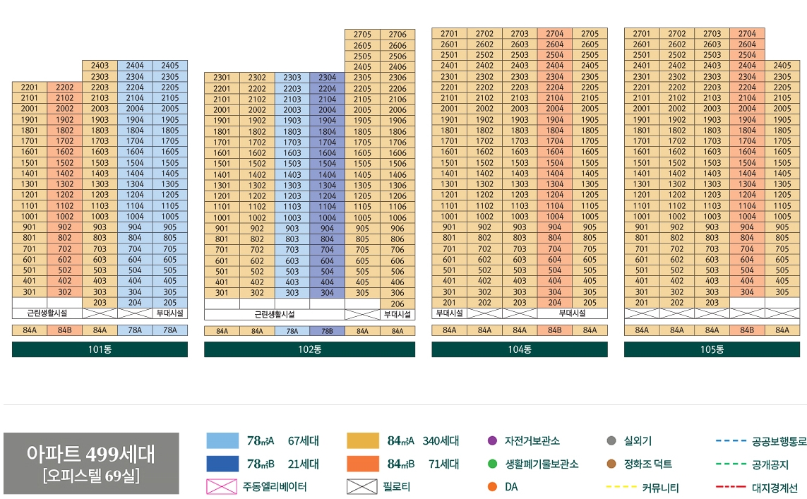 가장 인기가 많을것으로 예상되는 84A 타입이 가장 많이 분포되어 있고 동별로 근린생활시설 및 부대시설 분포하여 주민들이 편안하게 이용할수 있도록 설계하였습니다.
