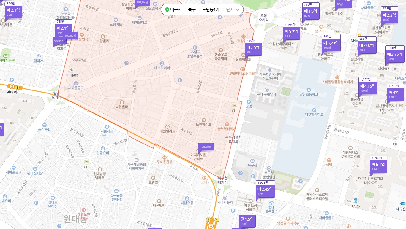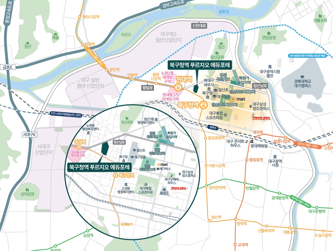 대구 지하철 북구청역과 원대역을 가깝게 이용할수 있는 대중교통환경과 단지 주변 홈플러스, 이마트 등 상권 형성 지역으로 생활의 편의성 극대화 되어 있는 지역 입니다. 또한 학원가 밀집지역이 가깝고 초, 중, 고등학교 인접하여 단지 이름에서도 알수 있듯이 교육에 특화된 곳이라고 이야기 할수가 있습니다.