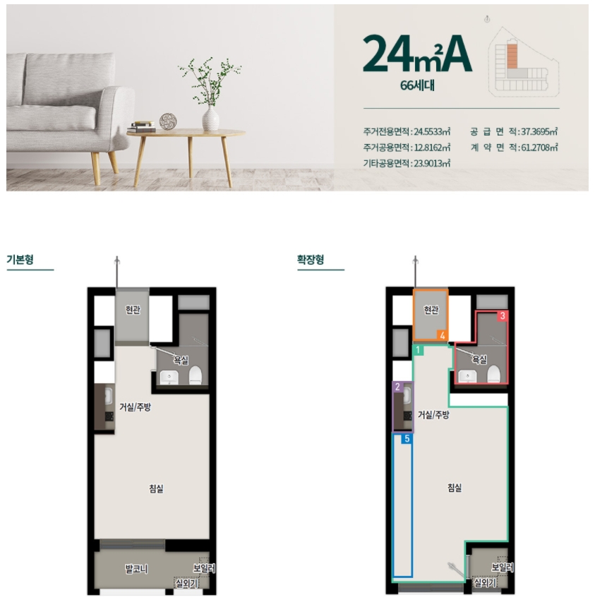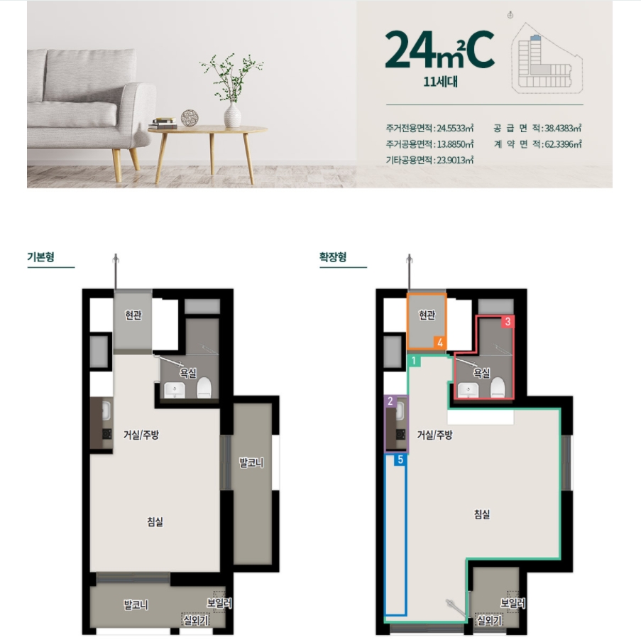24㎡ A와 C 타입의 차이점은 발코니에서 차이가 많이 나는데요 확장을 진행할 경우 C 타입이 더욱 넓은 집을 만들 수 있다는 장점이 있습니다. 확장 시 옵션으로 붙박이장을 선택할 수 있다는 점도 참고사항입니다.