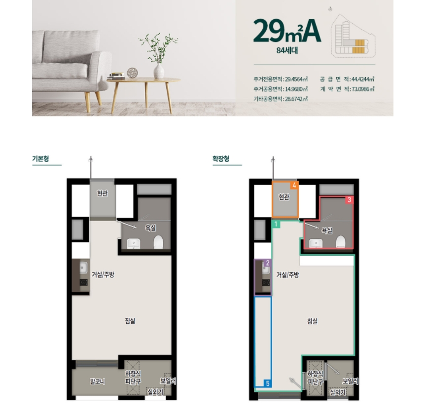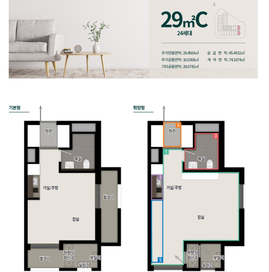 세운 푸르지오 헤리시티 아파트는 총 6가지 타입이 있는데요 24㎡A, 24㎡C, 28㎡A, 29㎡A, 29㎡C. 42㎡C 으로 나눌 수가 있는데요 크지 않은 사이즈이지만 신혼부부 및 직주 접근이 필요한 직장인에게는 딱 맞는 크기라 하겠습니다.