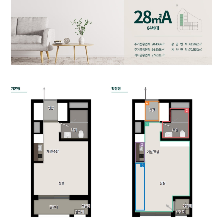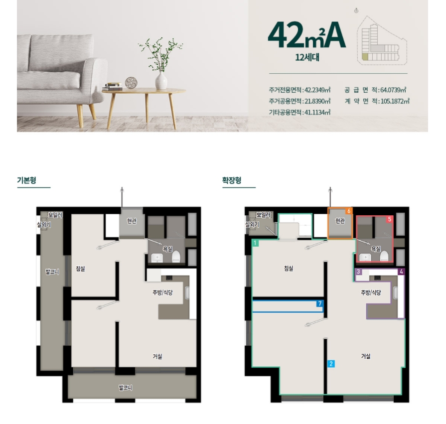가장 인기가 있을 것으로 예상되는 42㎡A 타입은 투룸 구조로 거실과 방을 따로 분리해서 사용할 수 있다는 장점이 있습니다. 다만 확장형일 때 방이 각진 형태로 보일 수 있지만 인테리어를 효과적으로 한다면 더욱 넓은 집을 구성할 수 있겠습니다.