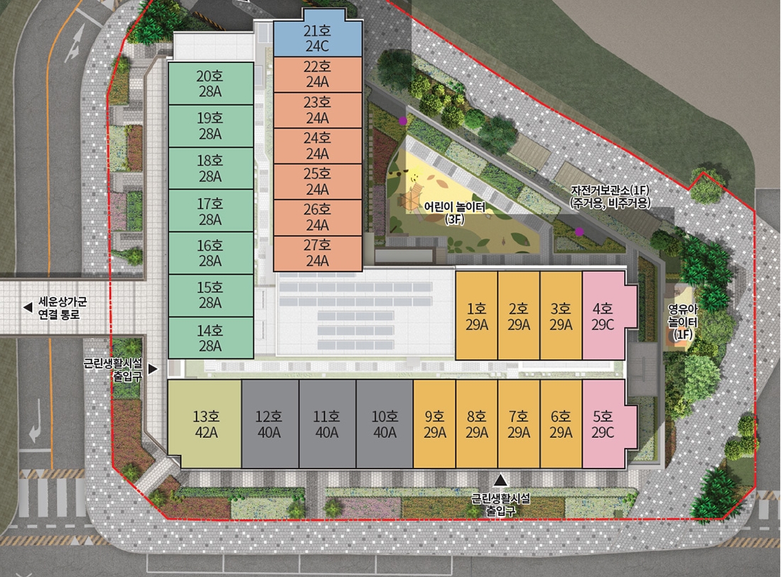 단지 내에 커뮤니티 가든과 어린이 놀이터 및 영유아 놀이터 구비되어 있고 옥상에 스카이가든 설치되어 있어서 산책하러 멀리 나가지 마시고 옥상에서 모든 것을 해결할 수가 있습니다. 서울 중심에 26층 건물의 옥상에서 바라보는 야경은 또 하나의 프리미엄이 되지 않을까 생각이 듭니다.