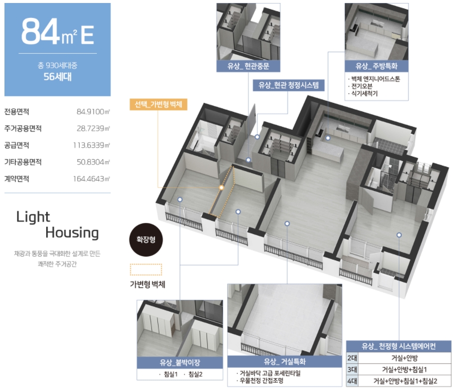 가장 많은 타입을 보유하고 있는 84타입은 총 A, B, C, D, E 타입으로 구성되어 있고 타입별로 알파룸이 존재하는 타입과 알파룸은 없지만 거실 및 주방이 넓은 타입 등으로 나눠볼수가 있겠습니다. 방은 좀 작더라도 알파룸을 원하시는 분이나 방은 3개만 있어도 되니 큰 방을 원하시는 분들로 취향을 나눠볼수가 있을꺼라 예상이 됩니다. 평면도 확인하셔서 원하시는 타입 생각해보시기 바랍니다.