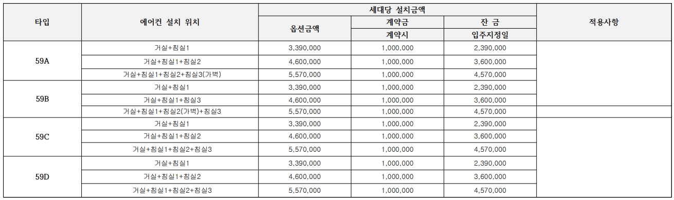 입주하시면서 시스템 에어컨 설치하시는 분들 많으신데요 각 타입별 시스템 에어컨 옵션 비용까지 고려하시면 분양가 산정하시기 편리할것으로 예상됩니다. 타입별 가격차이는 없고 설치 대수에 따라서 가격이 달라진다는 점 참고하시기 바랍니다.