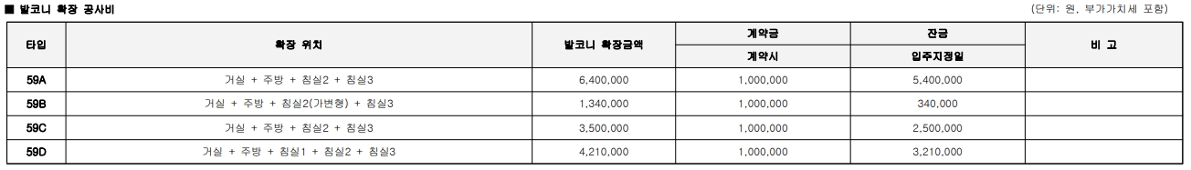 분양가는 동일하지만 발코니 확장비용에서 타이가 약간 생기는데요 타입별 발코니 확장 비용까지 고려하셔서 분양가 계산하시기 바랍니다.