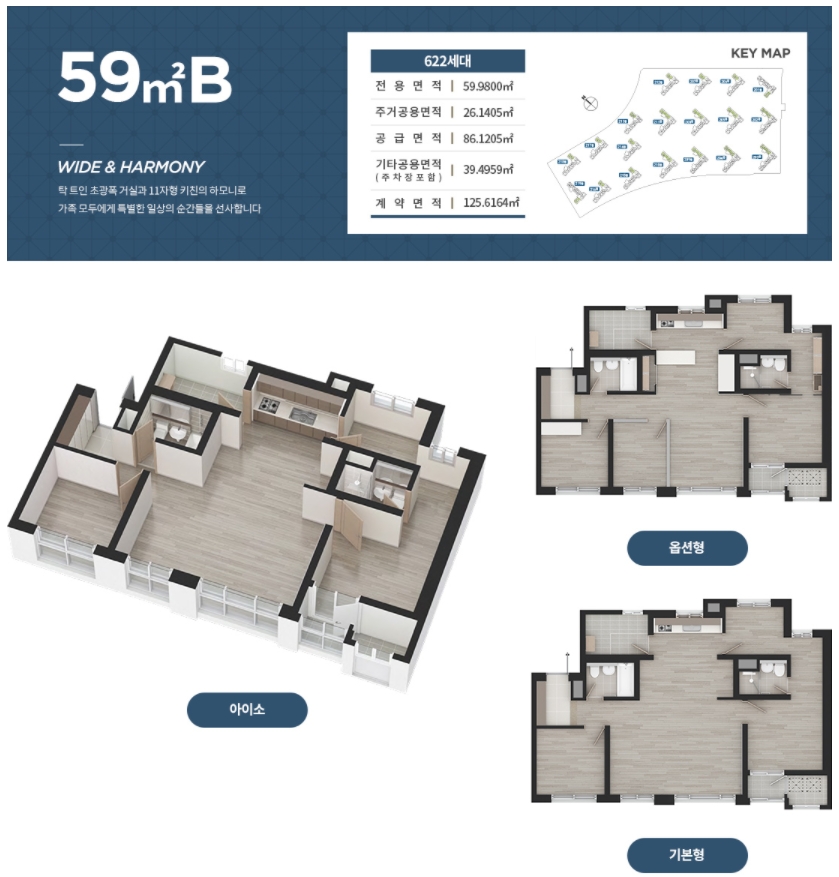 59A 타입은 기본적으로 방2개 화장실 2개 타입이지만 방3개를 옵션형으로 선택할수 있다는것이 특징이고 주방옆에 다용도실 위치로 인하여 편리한 수납 가능할것으로 보입니다.