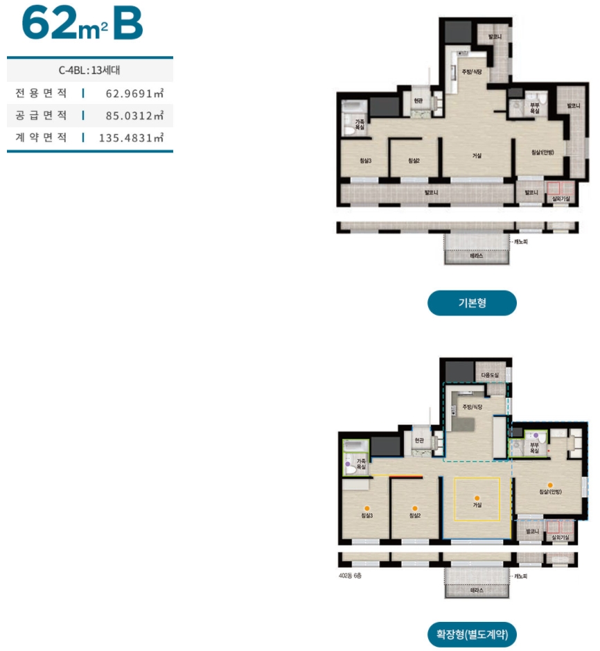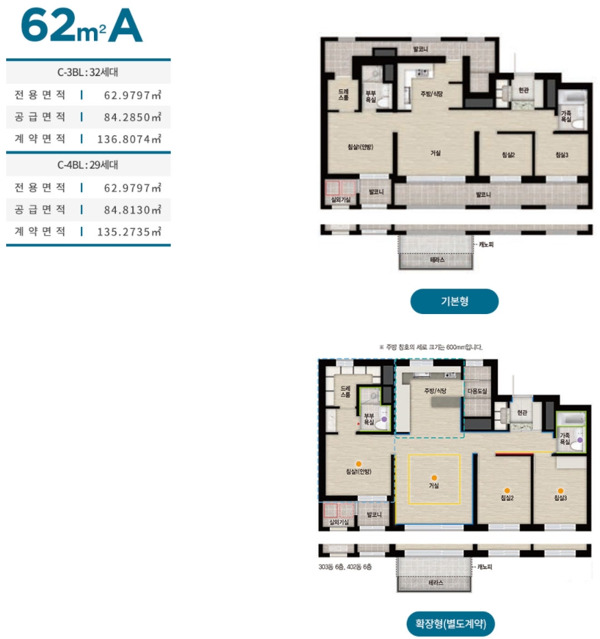 62 A, B 타입은 방3개 화장실2개 구조 입니다. 4Bay 구조로 개방감 좋을것으로 예상되는데요 확장형 선택시 넓은 드레스룸과 주방 및 다용도 실을 활용할수 있을것으로 예상이 됩니다. 타입별로 특정 호수에는 테라스가 존재하니 이부분도 체크해 보시기 바랍니다.
