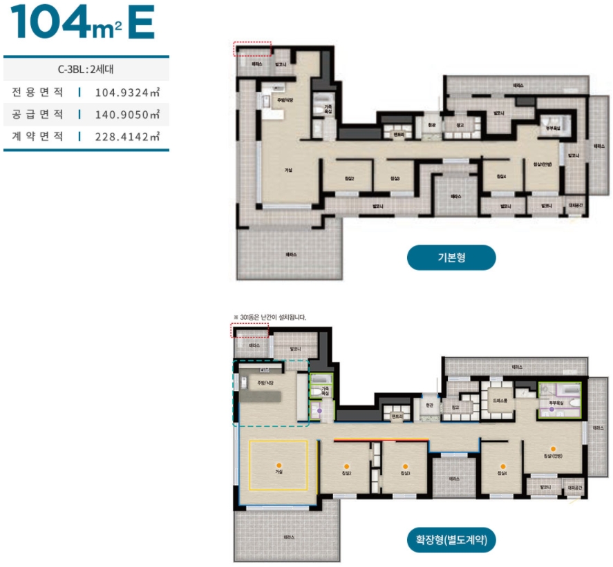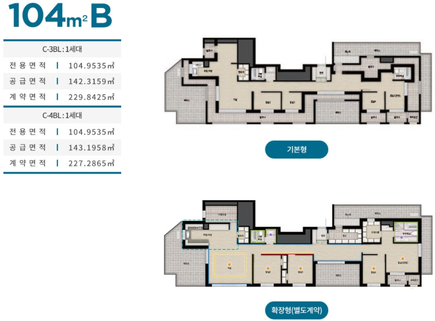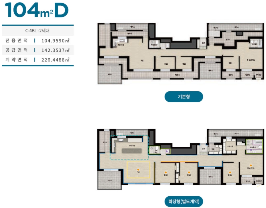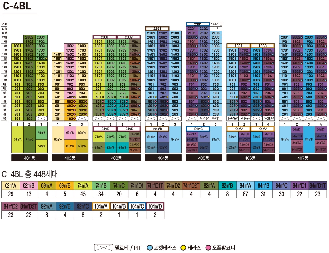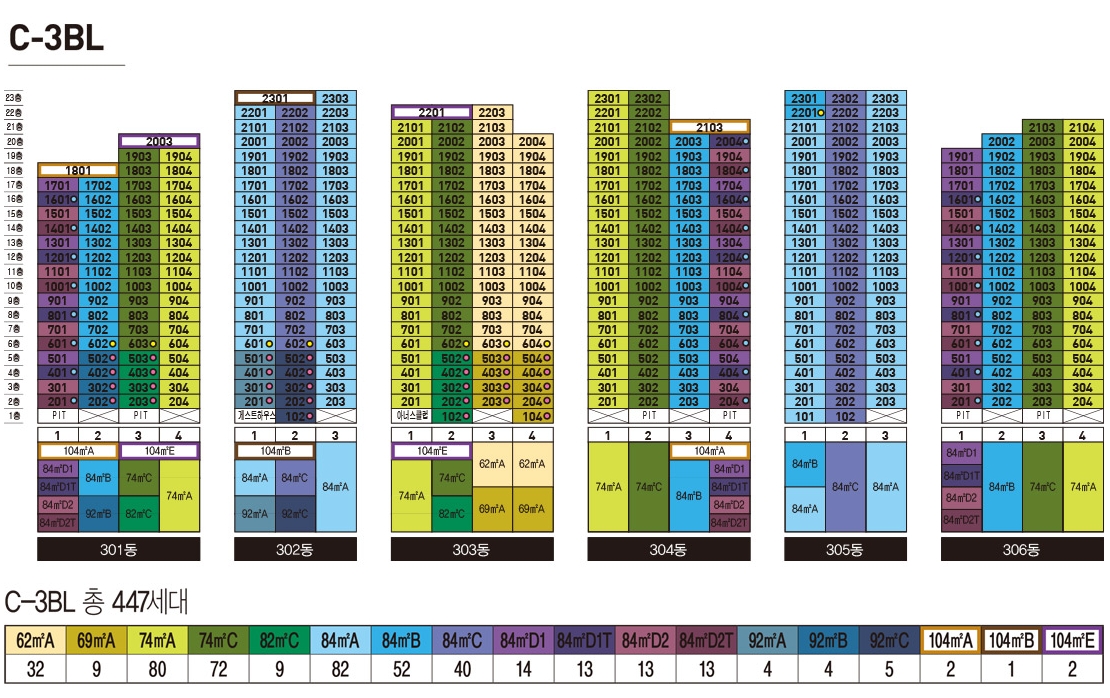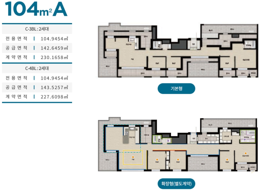 펜트하우스라고 볼수 있는 104 타입은 타입별로 1 ~ 2세대 존재하며 대부분 탑층에 위치해 있다는 것이 특징입니다. 쾌적한 삶은 원하시는 분들의 니즈에 딱 적당한 타입으로 보여집니다.