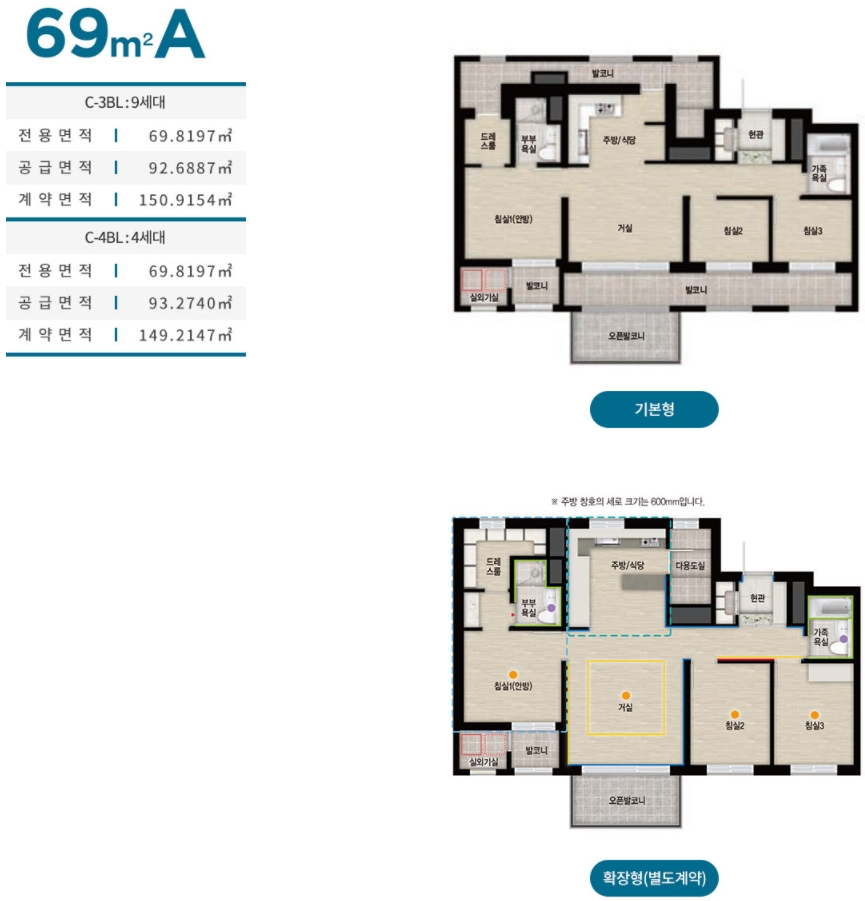 69 A, B 타입은 62 타입과 비슷한 형태를 띄고 있고 특징적인것은 특정호수에 오픈발코니가 존재한다는 것입니다. 더욱 넓은 세대를 원하시는 분들은 69타입이 좋은 선택이 될것 같습니다.
