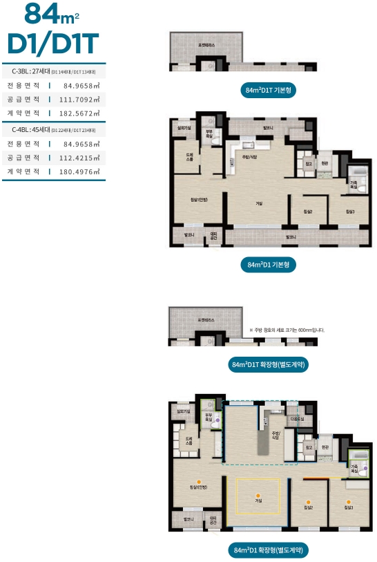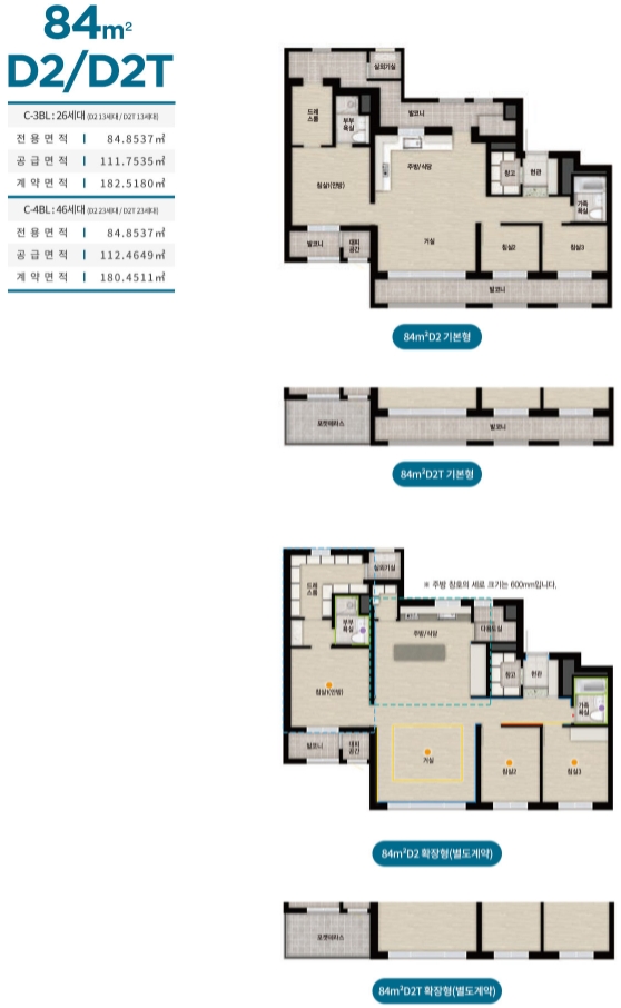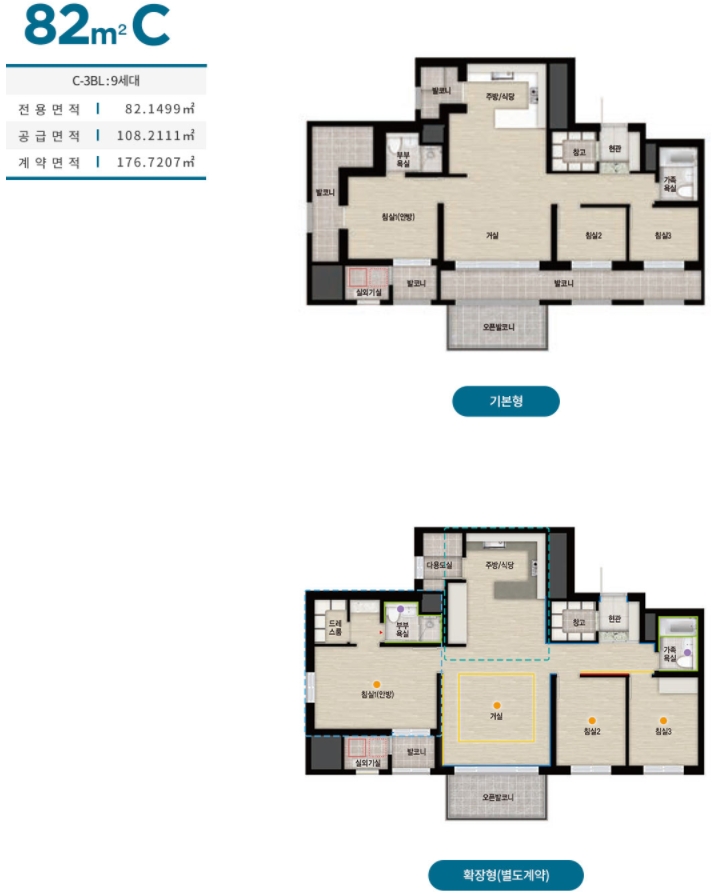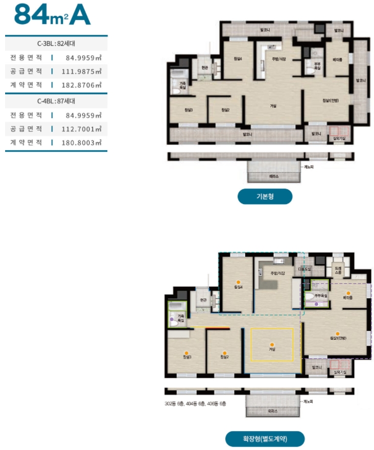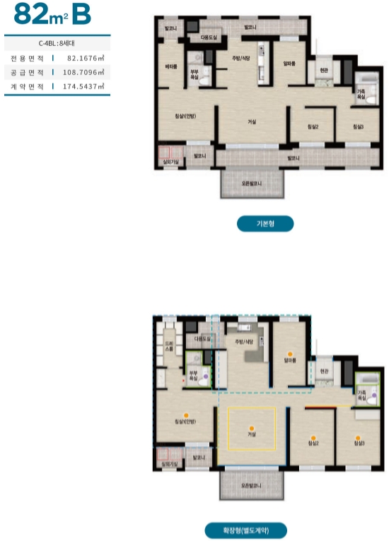 82타입은 총 3가지 타입으로 존재하는데요 모든 세대가 오픈 발코니가 존재하는데요 확장형으로 선택시 발코니의 유무가 생활의 질의 차이를 느낄수 있을정도가 될수 있으니 세대수는 작지만 인기가 많을 것으로 예상이 됩니다.