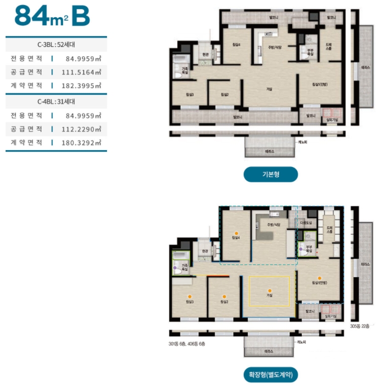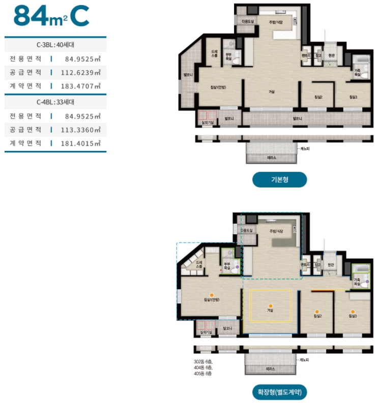84 타입은 역시 5개로 세분화 되어 있는데요 방4개 화장실2개 구성과 방3개 화장실2개 구성으로 나눠지는데요 거실의 크기의 변화가 있을수 있으니 기준을 잘 세워서 원하시는 타입을 선택하시면 될것 같습니다. 포켓테라스의 유무 역시 관심있게 보셔야 할 요소라고 생각됩니다.