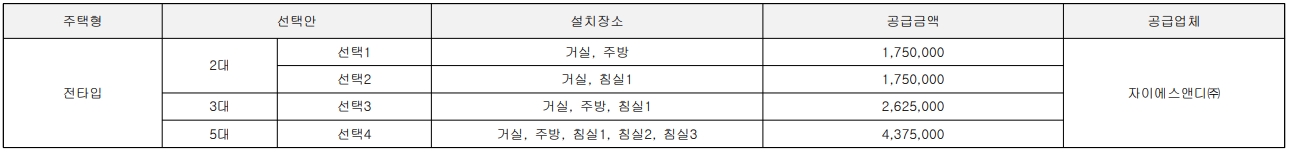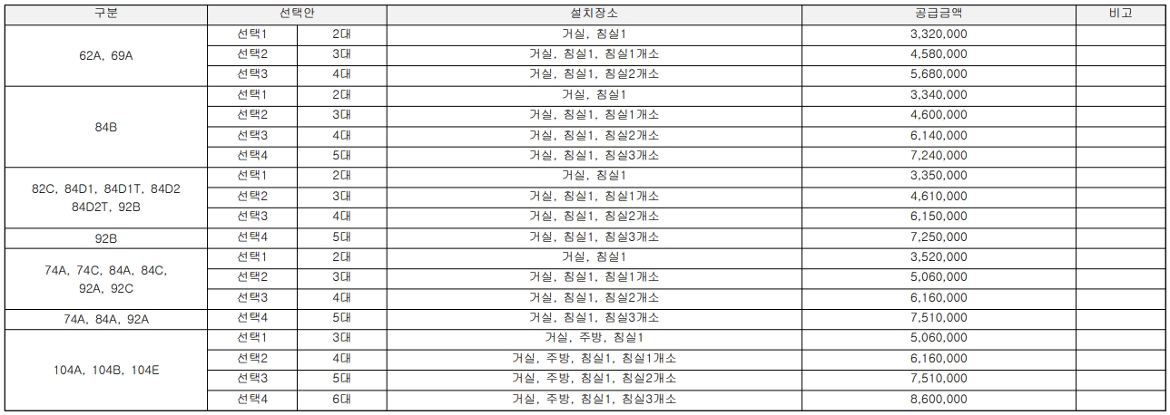 확장 비용은 타입별로 2500만원에서 5300만원 까지 분포되어 있는것을 확인 할수 있었습니다. 요즘은 새아파트 입주하면 방과 거실에 시스템 에어컨 설치하시는 분들도 계시는데요 오포 자이디오브는 LG 시스템 에어컨 및 공기 청정 시스템을 옵션으로 추가 할수가 있습니다. 시스템 에어컨 및 공기청정 시스템 추가 비용은 아래와 같습니다.