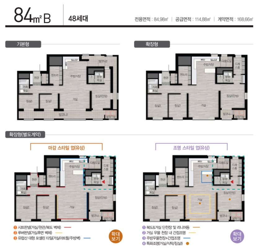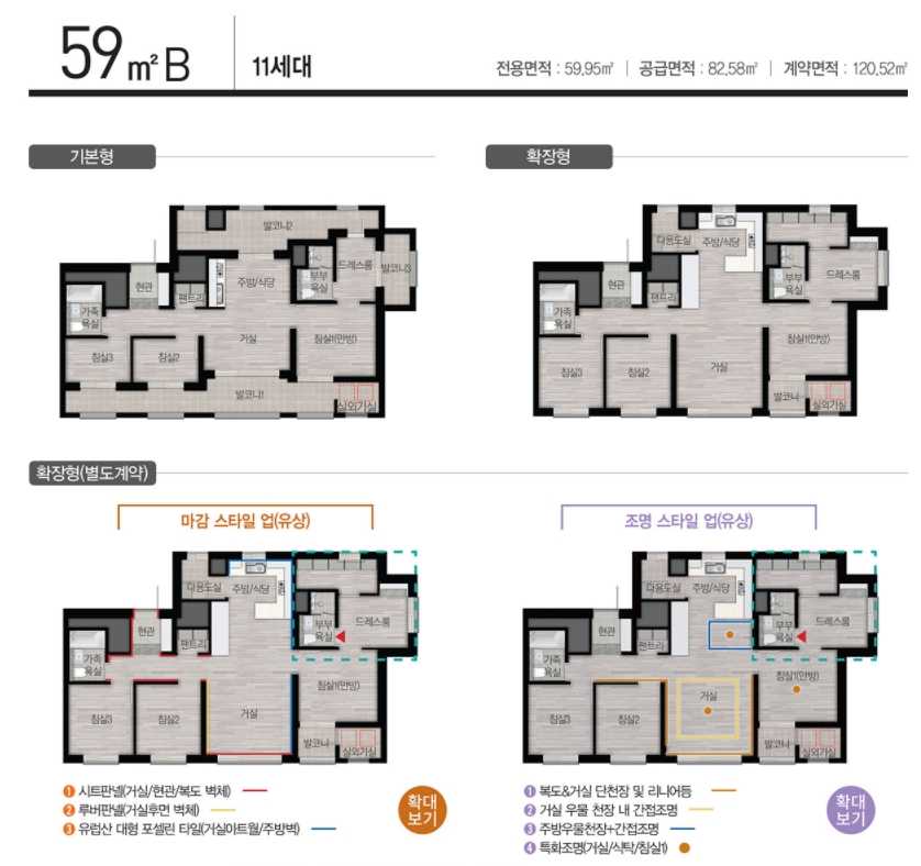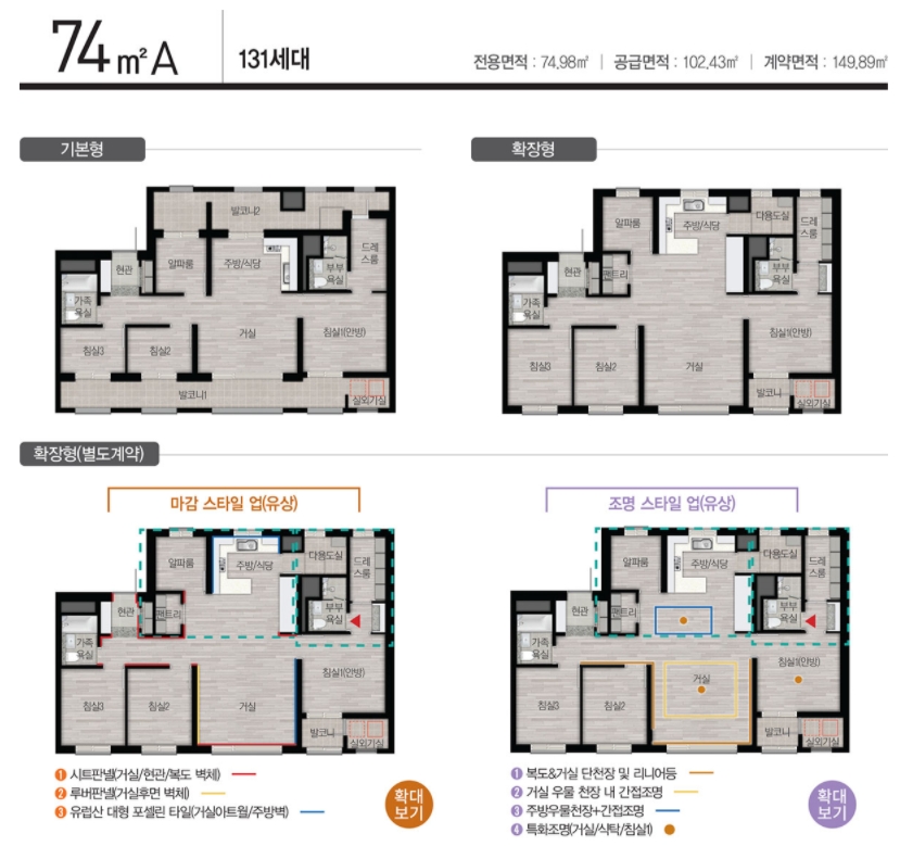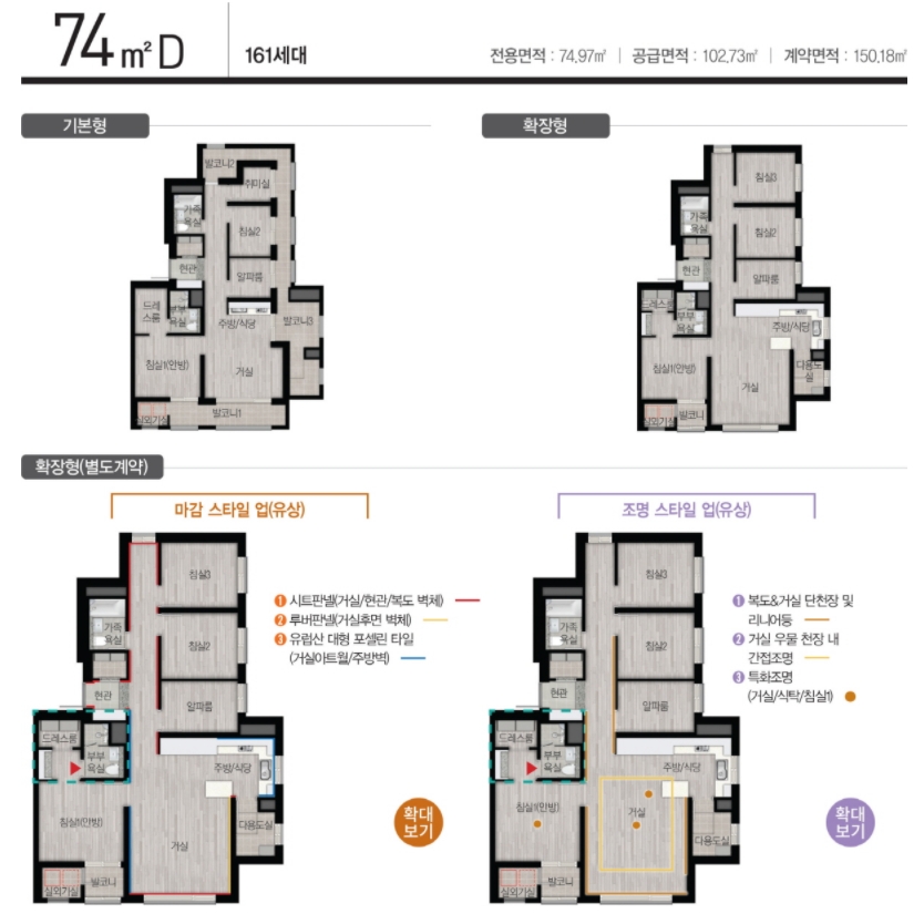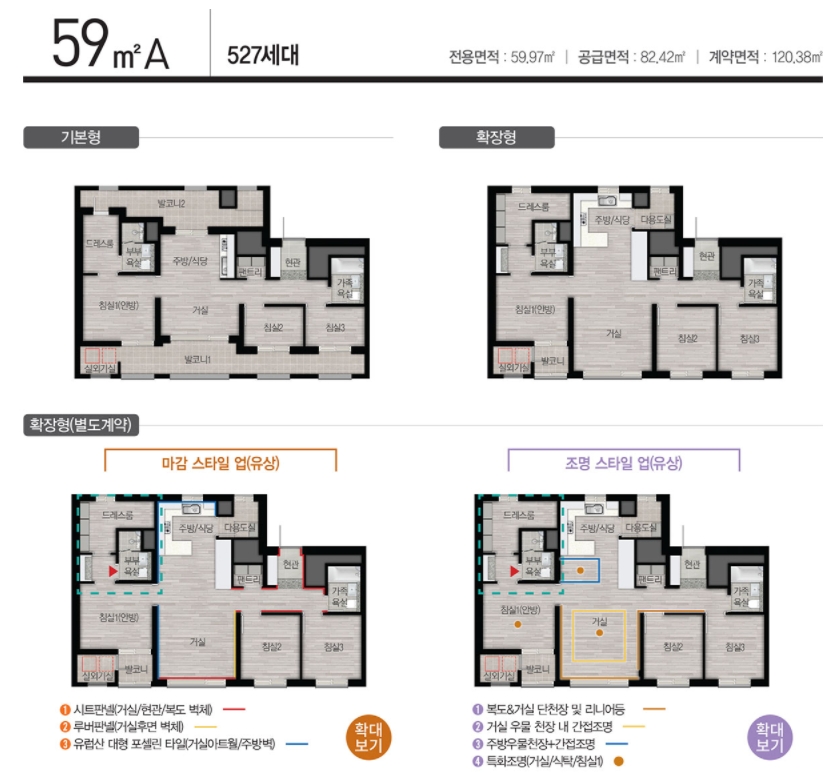 확장형으로 선택시 주방및 드레스룸을 크게 만들수가 있어서 더욱 편리하게 거주할수 있다는 장점이 있습니다. 다양한 스타일 업 옵션 역시 집의 분위기를 한층 더 업그레이드 시켜줄수 있는 요소라고 생각이 되는군요