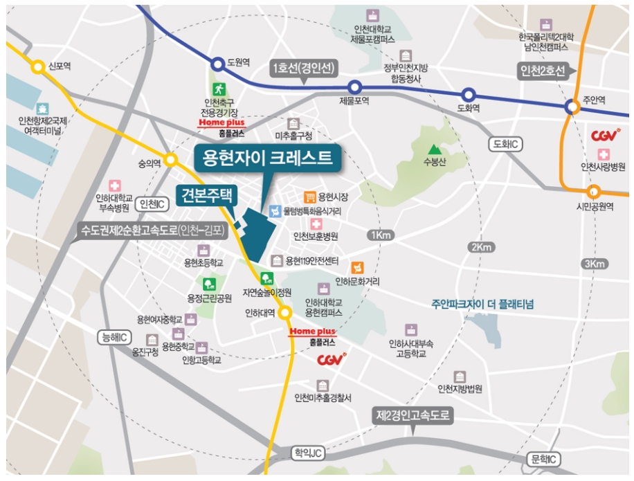 용현 자이 크레스트 입지조건은 제 1, 2, 3 경인고속도로와 인접해 있어서 다양한 도로 접근성을 갖춘 지역으로 고속도로 이용의 원활함과 지하철 수인분당선 숭의역 및 인하대역등을 이용할수 있는 대중교통의 접근성이 좋습니다. 또한 인하대학교 용현캠퍼스가 인접하여 있고 단지주변 초, 중, 고 밀집 지역으로 학원가 역시 잘 형성되어 있어서 자녀분들 교육 문제 때문에 걱정이신 분들에게는 좋은 입지조건을 보여준다고 할수 있습니다. 단지와 수봉산이 인접하여 있어서 숲세권 원하시는 분들에게도 어필할수 있는 용현 자이 크레스트 입지조건은 중상위 권에 들어간다고 볼수 있겠습니다.