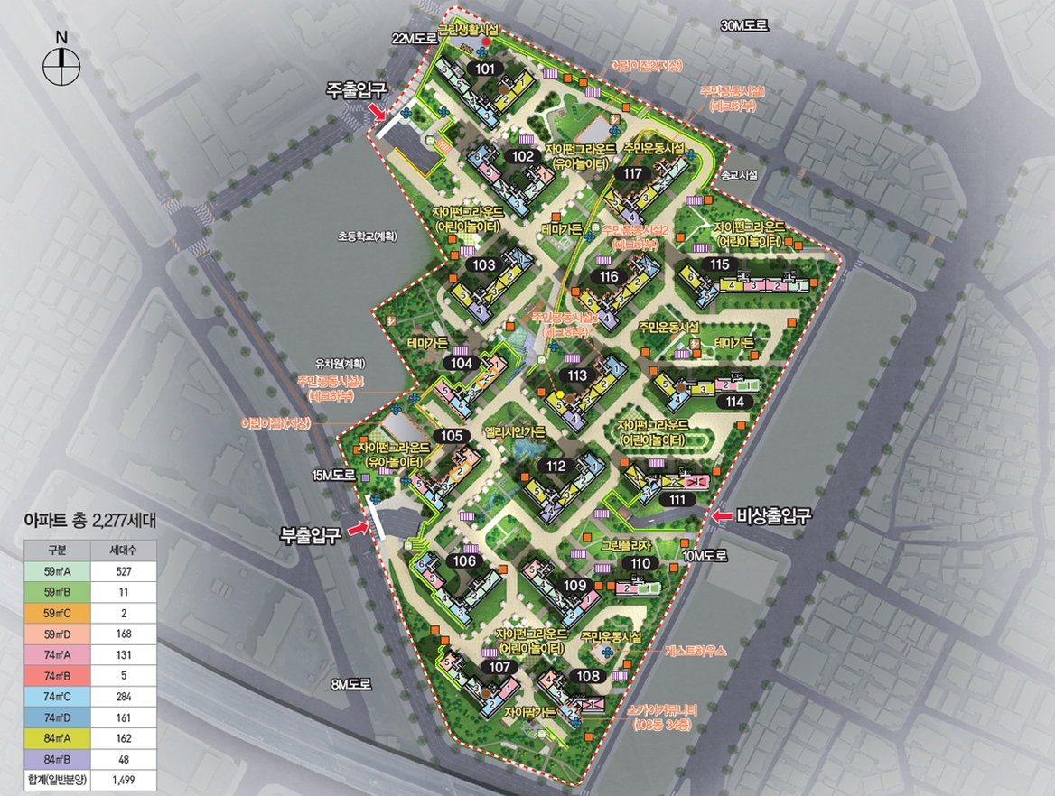 총 17개 동으로 구성되어 있는 용현 자이 크레스트 단지는 30미터 도로와 인접해 있는곳에 주 출입구를 두어서 막힘없이 단지로 들어설수 있고 부출입구 역시 8미터 도로에 인접해 있어서 원활하게 출입이 가능하다는 장점이 있겠습니다. 단지내에 아이들 놀이 시설을 여러곳에 설치해 두었고 주민운동 시설 및 산책로 까지 잘 갖춰서 자이의 명성에 걸맞은 단지 구성을 보여주고 있습니다.