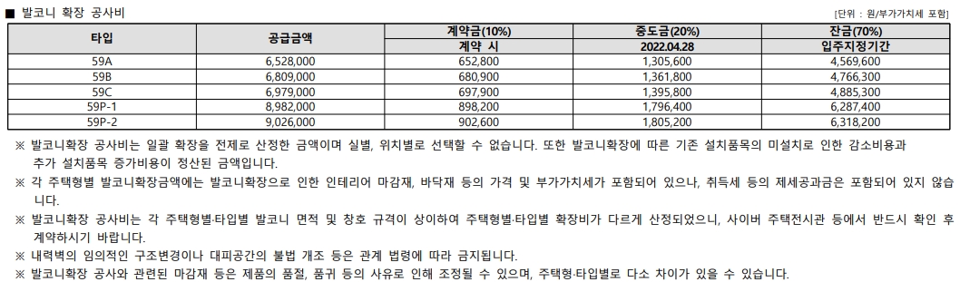 각 타입별 발코니 확장 공사 비용도 확인 하시기 바랍니다.