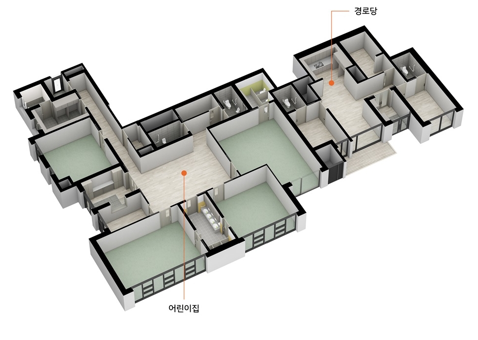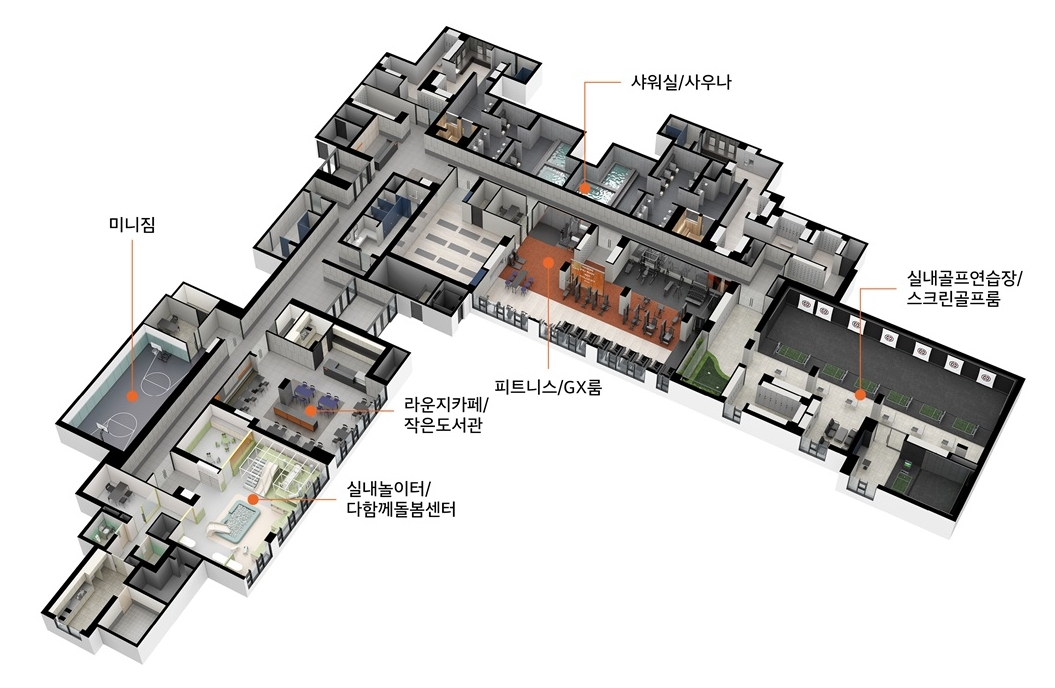 어린이집, 실내놀이터, 미니짐, 실내골프연습장, 스크린골프룸, 피트니스 스터디룸 등 다양한 커뮤니티 시설이 갖추어져 있어서 외부로 나가지 않아도 편리하게 이용할수 있도록 알찬 구성 되어 있는것이 특징적인 점 입니다.