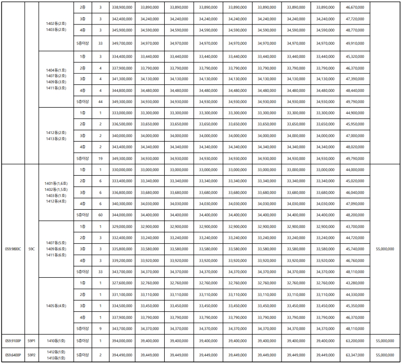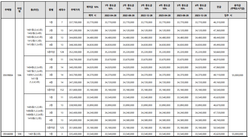 - 59B타입 : 333,000,000원 ~ 349,700,000원