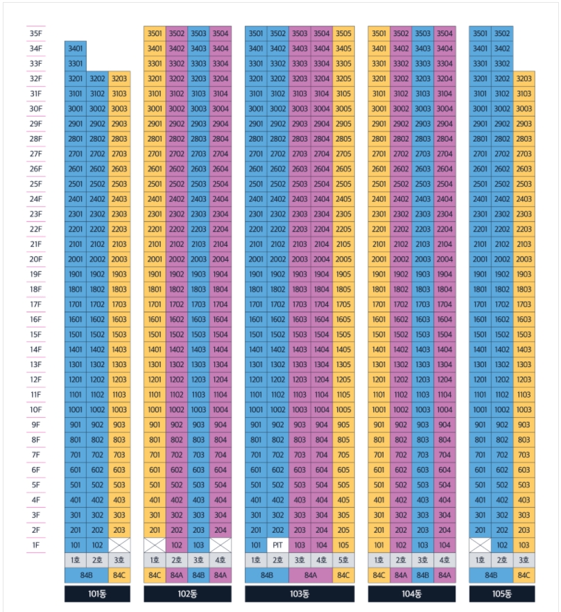 3가지 타입이 골고루 배치되어 있는 동호수 배치를 살펴볼 수 있는데요 원하는 타입이 어디에 배치되어 있는지 미리 확인하신다면 청약에 더욱 큰 도움이 될 것으로 판단됩니다.