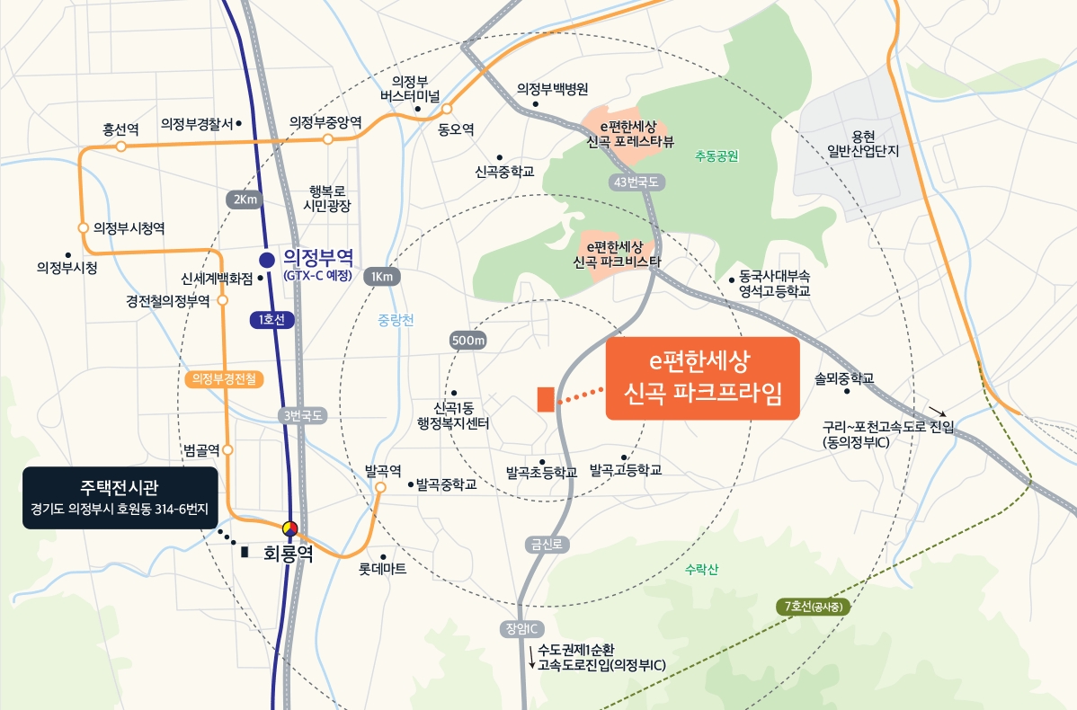 GTX-C 노선 예정으로 미래가치를 높여줄 것으로 기대되는 이편한세상 신곡 파크프라임의 입지환경은 매우 우수하다고 할수 있겠습니다. 단지 주변 초, 중, 고등학교 위치로 자녀 안심 교육은 물론이고 의정부 IC, 동의정부IC 등 서울과의 접근성을 높여주는 다양한 출퇴근 교통망으로 자녀와 부모님 모두 만족스렁운 생활이 가능할것으로 예상됩니다.