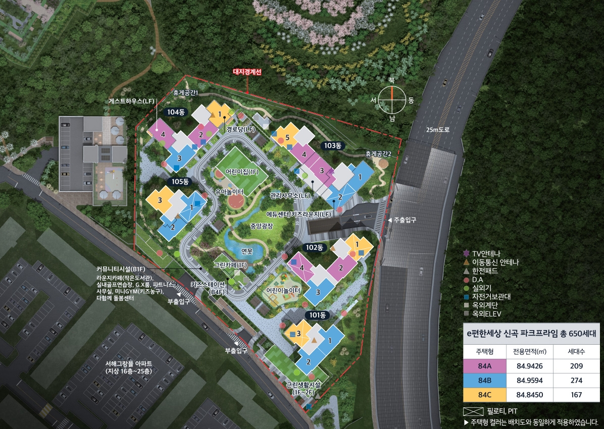 대부분 세대가 남향으로 배치되어 있어서 채광을 충분히 확보한 설계를 진행하여서 밝은 집에서 거주가 가능할 것으로 예상되고 중앙광장을 중심으로 배치되어 있기 때문에 모든 세대에서 다양한 커뮤니티 시설 이용에 편의성을 제공할 것으로 보입니다.
