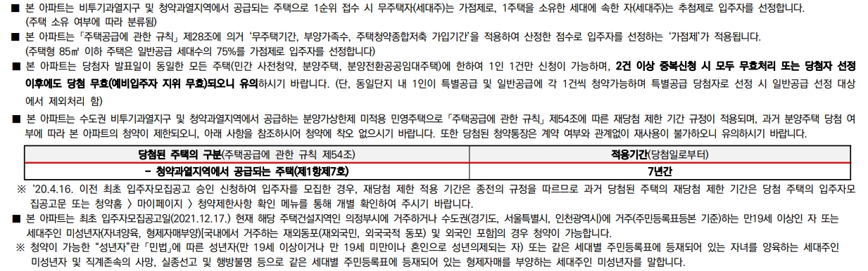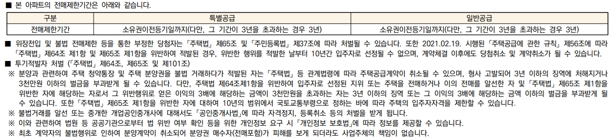 이편한세상 신곡 파크프라임 아파트는 비투기과열지구 및 청약과열지역에서 공급되는 주택으로 당첨자로 선정 시 7년간 재당첨 제한을 적용받게 됩니다. 또한 특별공급과 일반공급 모두 3년간 전매 제한을 적용받는 점도 참고하시기 바랍니다.