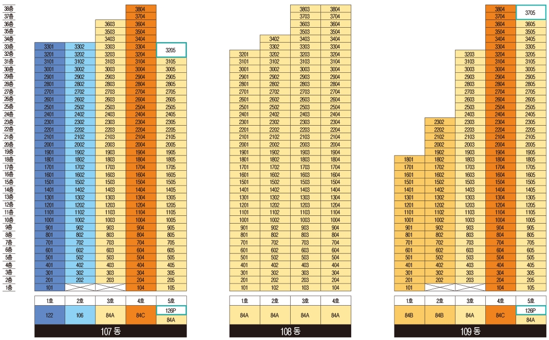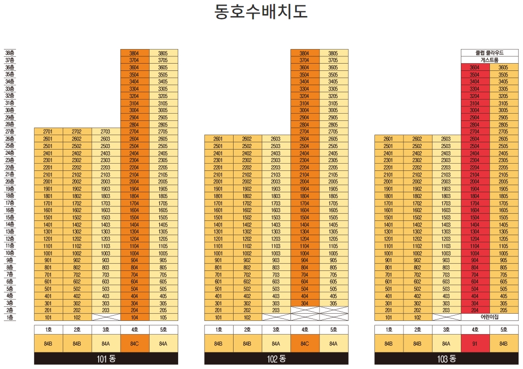 각 타입별로 배치되어 있는 동호수 배치도를 살펴보면 84A타입이 가장 많은 분양세대수를 자랑하는 만큼 골고루 분포되어 있는 모습을 볼수 있습니다. 자신이 원하는 타입이 어느 동에 배치되어 있는지 미리 살펴보신다면 청약 진행하실 때 좀 더 선택을 용이하게 진행하실 수 있을 것이라 판단됩니다.
