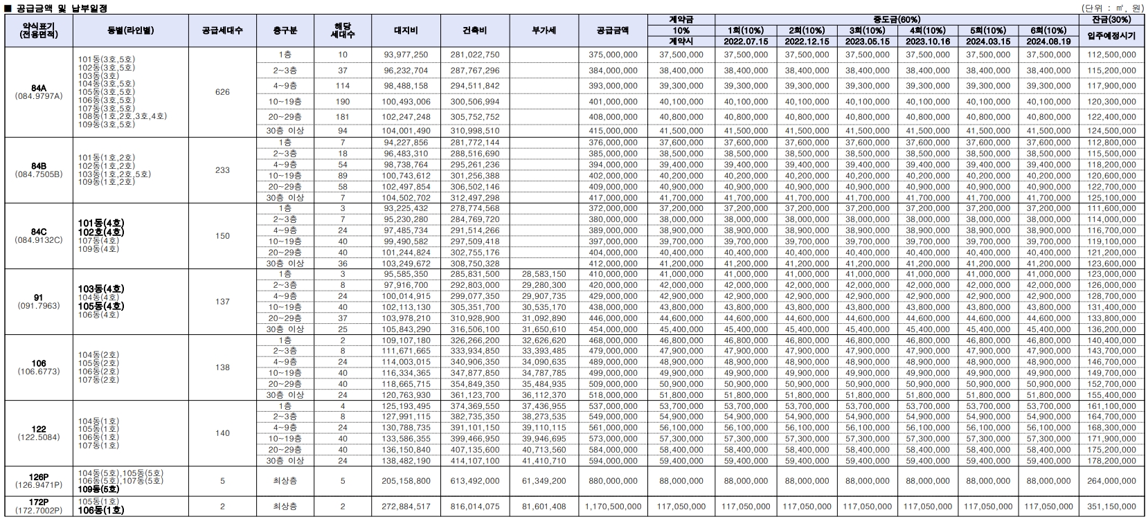 - 84A타입 : 375,000,000원 ~ 415,000,000원