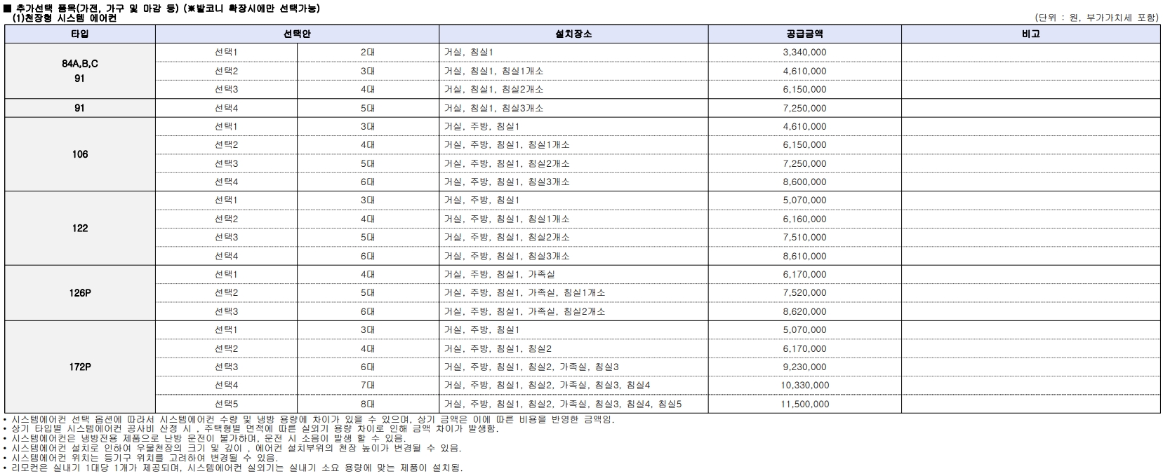 타입별 분양가 및 발코니 확장 비용
