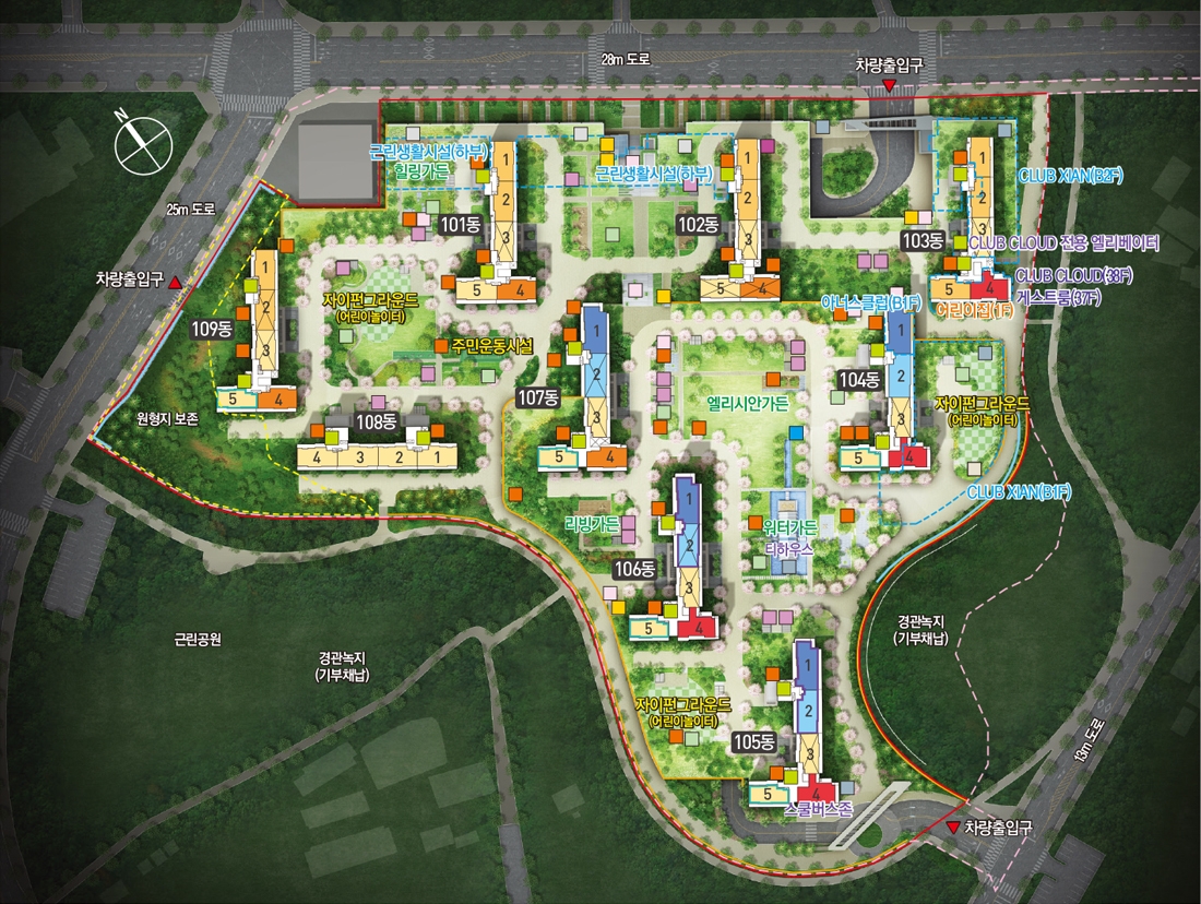 대부분의 단지가 남동향 또는 남서향으로 배치되어 있어서 채광이 아주 우수할 것으로 예상되며 주차장을 모두 지하화 해서 공원처럼 꾸며진 단지 설계도를 볼 수가 있습니다.