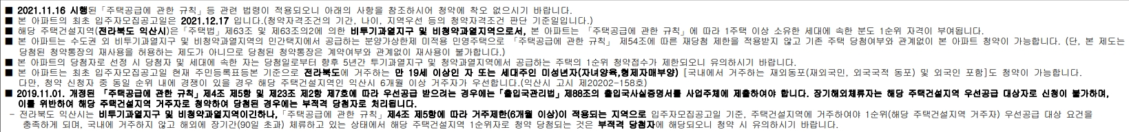 전라북도 익산시는 비투기과열지구 및 비청약과열지역으로서 당첨자 및 세대에 속한 자는 당첨 일로부터 향후 5년간 투기과열지구 및 청약과열지역에서 공급하는 주택의 1순위 청약접수가 제한됩니다.